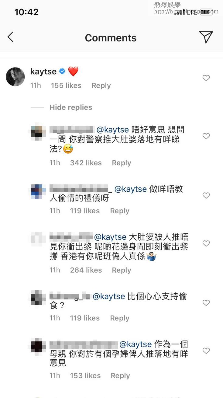 細蘇偷食事件驚爆娛圈,他的一班好友在兩公婆出帖文紛表支持,當中與細蘇相熟的謝安琪(Kay)就各自在二人的帖文上給心心emoji表支持,而張繼聰就在Wing的帖文給心送暖,再留言:「一家人,一條心」。Kay純粹表達對細蘇兩公婆關心的一個emoji心心卻引來網民熱烈不滿,有近百個網民在她的心心評論留言,當中不少人認為Kay「給心」支持偷食,留言狂鬧:「心代表支持偷食?」、「全力支持偷食行為」、「如果係張生會唔會畀心」、「可能佢覺得偷食出軌係一件美事?」、「睇實啲你老公啦,有個咁嘅叔仔,加上你哋啲偽人, 真係表面越係好好先生越難(爛)滾呀」,更有網民更將Kay陳年曾與陳奕迅傳過緋聞來講:「佢都傳過偷食Eason啦實無問題」,亦有人追問她8.31孕婦被警察推跌為何不出聲,朋友偷食就衝出來「給心」,亦有人重提藍奕邦沒開名指她是「偽民主女神」、指她那位做警察的叔仔張繼安打香港人等舊事揚出來。