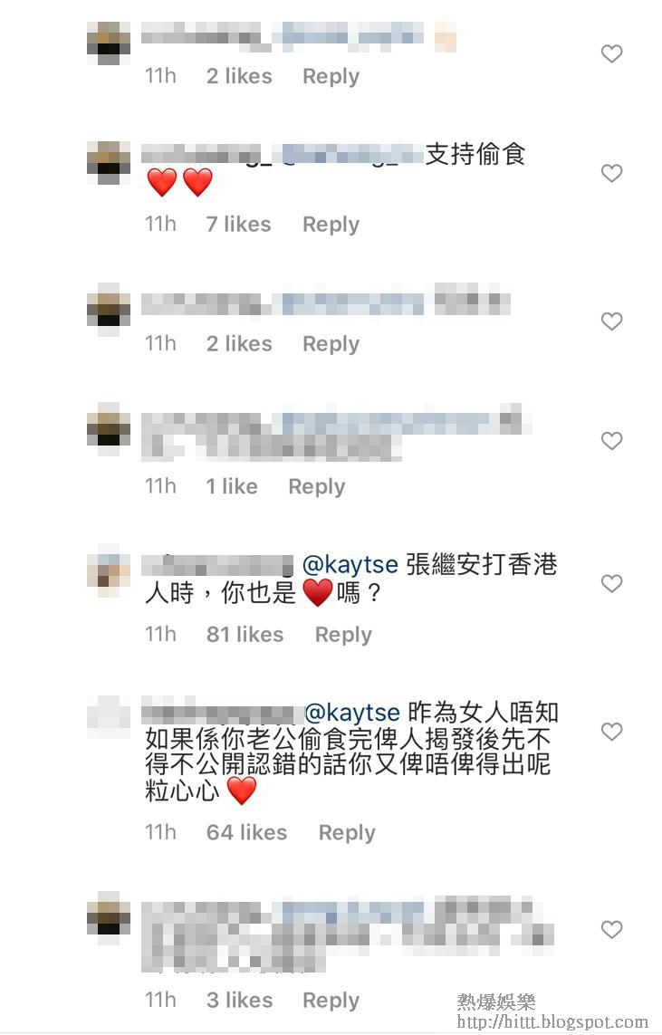 細蘇偷食事件驚爆娛圈,他的一班好友在兩公婆出帖文紛表支持,當中與細蘇相熟的謝安琪(Kay)就各自在二人的帖文上給心心emoji表支持,而張繼聰就在Wing的帖文給心送暖,再留言:「一家人,一條心」。Kay純粹表達對細蘇兩公婆關心的一個emoji心心卻引來網民熱烈不滿,有近百個網民在她的心心評論留言,當中不少人認為Kay「給心」支持偷食,留言狂鬧:「心代表支持偷食?」、「全力支持偷食行為」、「如果係張生會唔會畀心」、「可能佢覺得偷食出軌係一件美事?」、「睇實啲你老公啦,有個咁嘅叔仔,加上你哋啲偽人, 真係表面越係好好先生越難(爛)滾呀」,更有網民更將Kay陳年曾與陳奕迅傳過緋聞來講:「佢都傳過偷食Eason啦實無問題」,亦有人追問她8.31孕婦被警察推跌為何不出聲,朋友偷食就衝出來「給心」,亦有人重提藍奕邦沒開名指她是「偽民主女神」、指她那位做警察的叔仔張繼安打香港人等舊事揚出來。