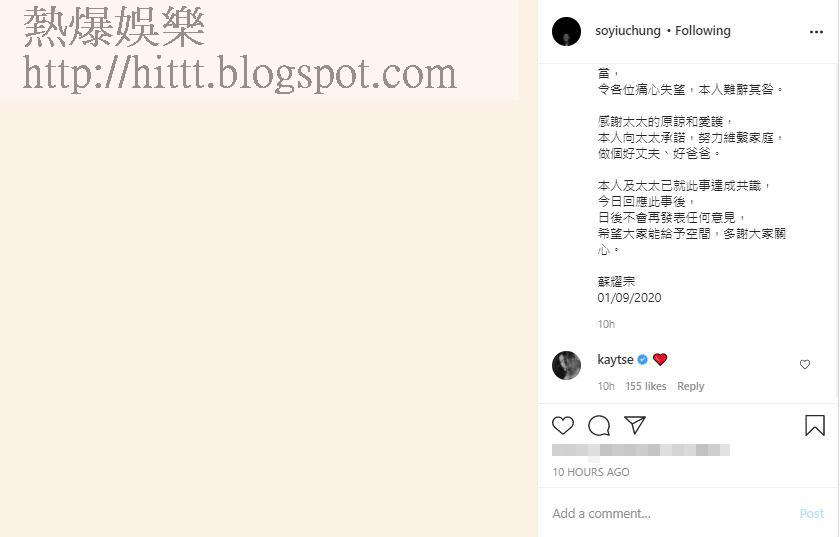 商台前DJ蘇耀宗(細So)驚爆背妻偷食KOL「阿B」,孽緣糾纏長達兩年半,更在葵涌租私竇做炮房幽會,直至今年6月才玩完,偷食事件曝光後,細蘇向《蘋果》承認此事,更向太太陳頴楠(Wing)講了7個「對不起」,而他與老婆深夜在IG出帖文,細蘇再一次承認感情上做錯及處理不當,而Wing就選擇原諒偷食老公,留言:「一輩子的婚姻旅程中,總有高山低谷要一起走過。我選擇相信,並肩繼續這段旅程。」