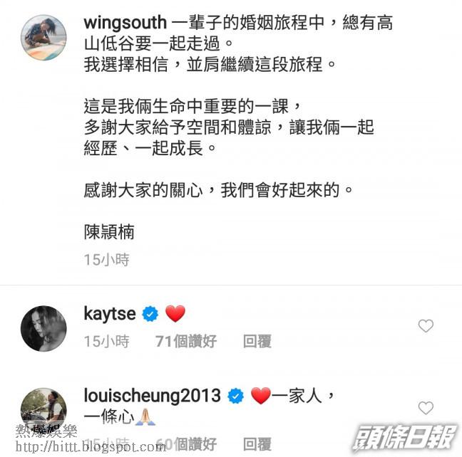 與兩夫婦相熟的謝安琪(Kay)分別在細So及蘇太的IG post留心心Emoji,而張繼聰同樣在Wing帖文給予心心Emoji及留言:「一家人,一條心」以示支持。不過Kay的心心Emoji卻辣㷫網民被圍插,有網民質疑Kay畀心是否代表支持偷食?亦有網民叫佢顧掂屋企嗰件先,好惡呀。