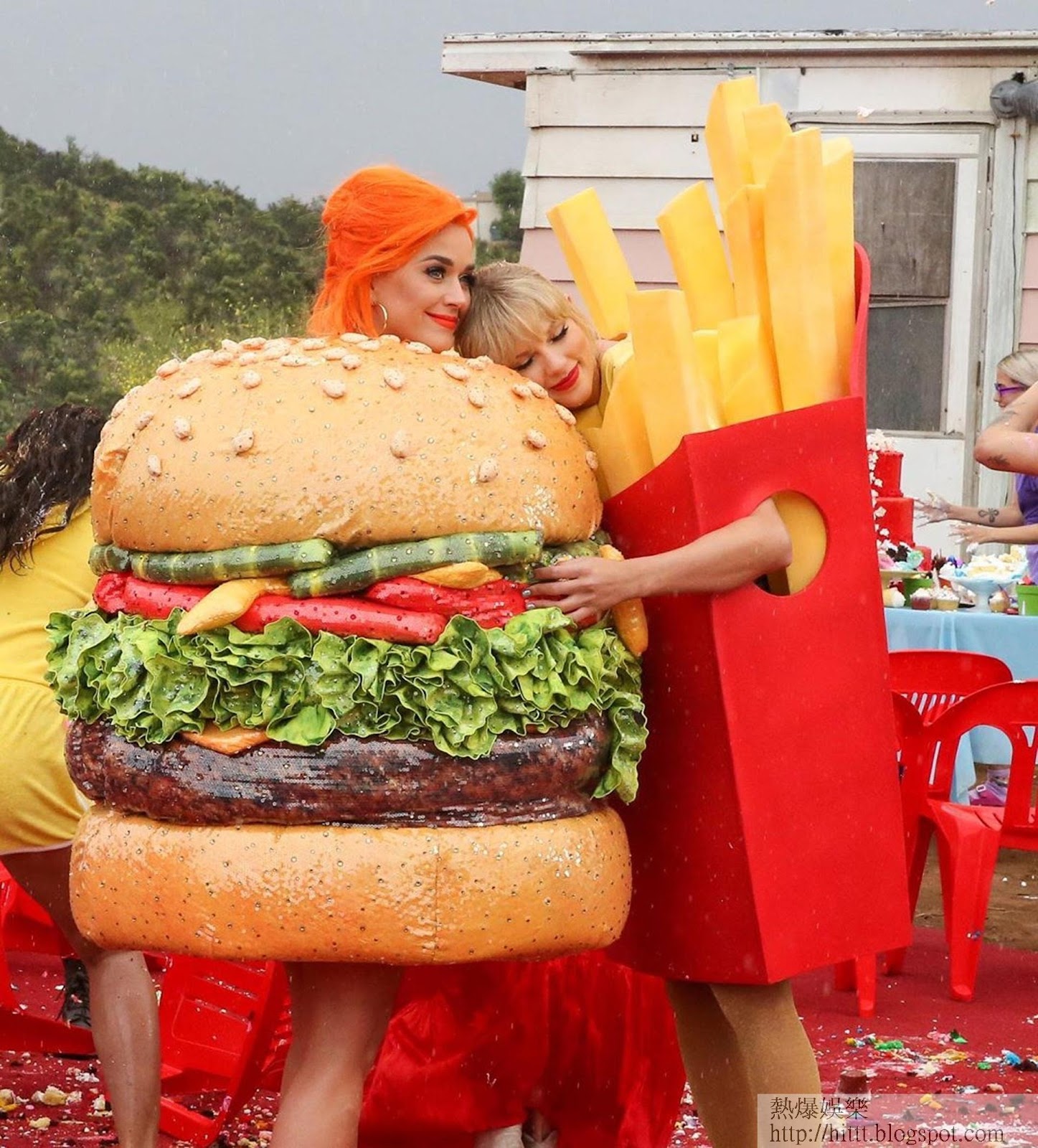 Taylor與Katy更變裝成漢堡包同薯條擁抱,上演「世紀大和解」,是2013年後兩人首次公開合作。(IG@taylorswift)