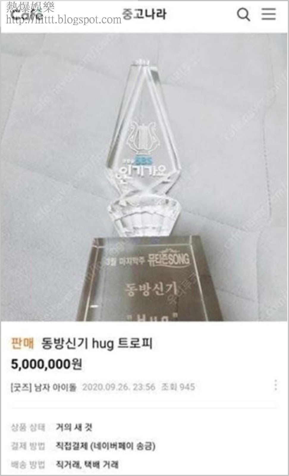 近日韓國二手交易網上,突然有人出售東方神起憑出道歌《HUG》於音樂節目上奪得的冠軍獎座,該出售貼文寫道:「這是東方神起出道後得到的第一個獎座。商品包括獎座和盒子。」而商品狀態是「幾乎全新」,價格是5百萬韓圜(約3.3萬港元)。