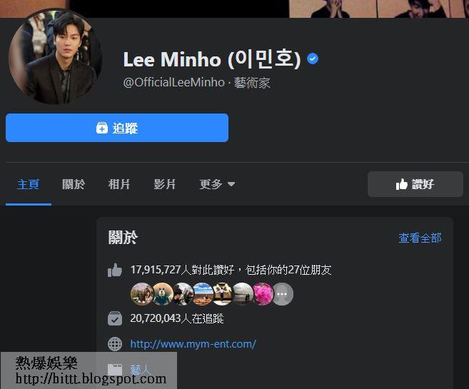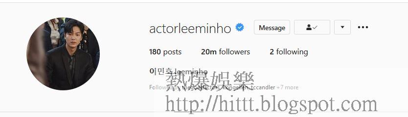 李敏鎬的官方FB於上月突破2千萬fans追蹤後,今日其IG的關注人數亦突破2千萬,事務所亦有公開紀錄「2千萬」的照片,答謝fans的支持。據了解李敏鎬在社交網的影響非常驚人,當中微博的關注人數亦達2,863萬,twitter亦超過了300萬關注,屬韓國明星中的表表者。