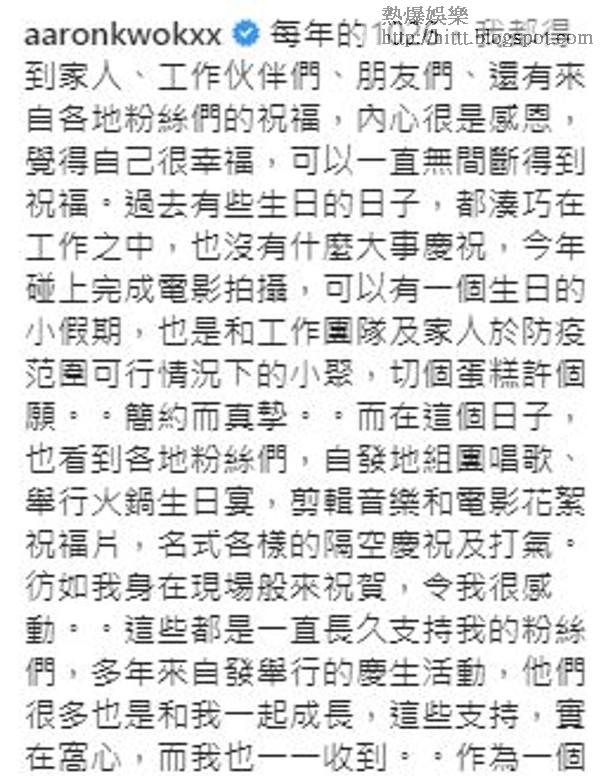 而演藝事業他都非常重視,覺得能夠得到大家的支持實在是莫大福氣,會把這些支持化成動力,努力地做好每個作品,與大家分享。他說:「我也謝謝和我合作無間的團隊,對我一直的用心和支持。也謝謝家人帶給我的快樂。有團隊才有力量,有粉絲就有動力。有家就有愛。謝謝大家在1026的祝福。希望大家都開心平安。我今天生日很快樂!祝大家也快樂。謝謝各方支持。」而方媛則晒出蛋糕相,留言祝福老公生日快樂。