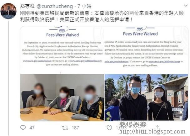 鄭存柱在Twitter公開港人獲美國政治庇護的消息。