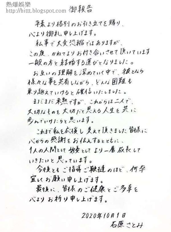 又一位女神封盤!33歲的石原聰美主演的新劇《默默奉獻的灰姑娘~醫院藥劑師的處方箋》上月底才大結局,今日就突然宣布與同齡圈外男友閃婚。石原附上親筆信向粉絲坦白:「不好意思,我有些私事要公布,我將會與一名圈外人結婚。在了解彼此的過程當中,發現大家有很多共通點,我堅信可以與他一起度過任何困難。」石原又感謝一直以來支持她的fans,表示在日後仍會努力做一名女演員,即婚後不會引退。據日本傳媒報導,二人透過朋友介紹認識約1年,預計在今年內註冊結婚。