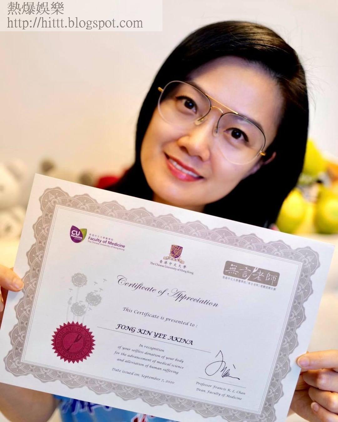 現年43歲的方健儀,一向熱心公益事務,畢業於中大的她,最近更決定為母校香港中文大學醫院登記成為「無言老師」,在死後捐出遺體作為醫科教學之用。方健儀在IG分享她成功登記成為「無言老師」的證書,她寫道:「我好開心宣佈我的志願,將來做一位無言老師,協助醫療技術的發展,令更多病人重獲新生。」