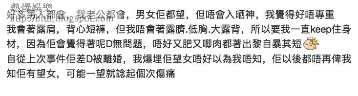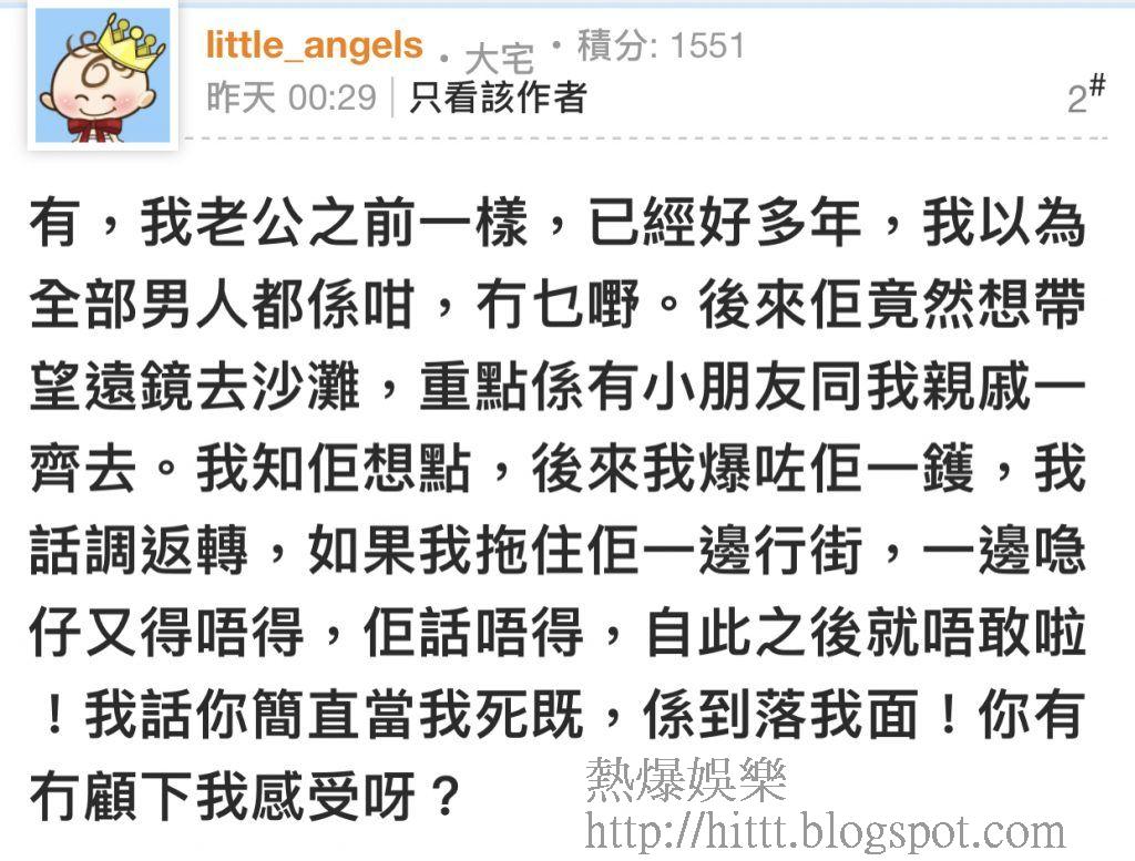 有,我老公之前一樣,已經好多年,我以為全部男人都係咁,冇乜嘢。後來佢竟然想帶望遠鏡去沙灘,重點係有小朋友同我親戚一齊去。我知佢想點,後來我爆咗佢一鑊,我話調返轉,如果我拖住佢一邊行街,一邊喼仔又得唔得,佢話唔得,自此之後就唔敢我話你簡直當我死嘅,係到落我面!你有冇顧下我感受呀?