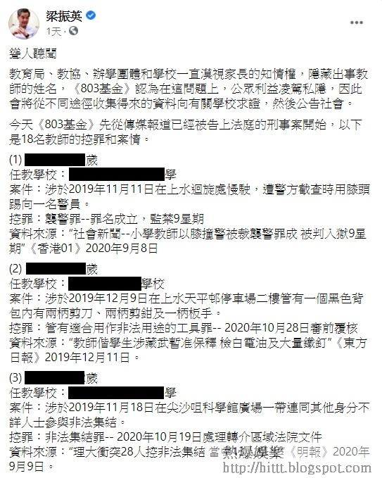 事緣梁振英連日來不斷在facebook,追擊教育界,日前更詳列過去18名在反修例事件中,涉及不同案件的教師個人資料,包括姓名、年齡、任教學校、案件及控罪,當中部份案件並未審結。