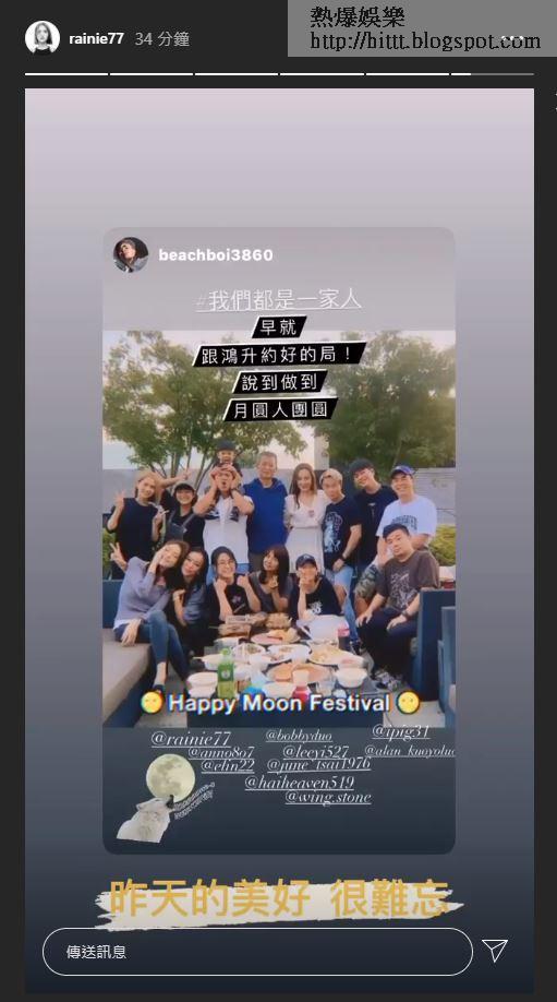此外,楊丞琳今晚亦於IG Story分享了朋友的post,原來她跟友人昨日約了黃鴻升(小鬼)的爸爸及胞妹等,一同預祝中秋節,post內還打上「早就跟鴻升約好的局!說到做到,月圓人團圓」,以及「我們都是一家人」的hashtag,楊丞琳亦留言說:「昨天的美好,很難忘」。