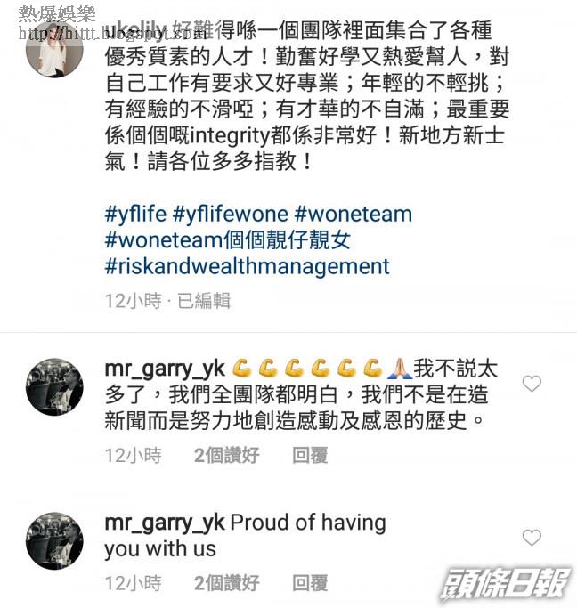 康子妮昨日在社交網貼上多張與公司同事的合照,留言大讚公司團隊集合優秀人才,請各位指教。Garry留言:「我不說太多了,我們全團隊都明白,我們不是在造新聞而是努力地創造感動和感恩和的歷史。」之後他又再留言:「Proud of having you with us」。