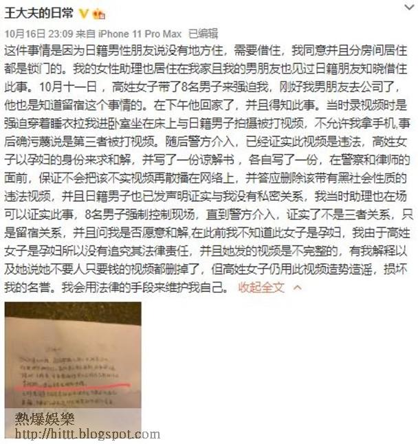 昨晚王梓芠在微博上載諒解書力證清白,並表示當時被迫著上睡衣拍攝,又指日籍男友人稱「冇地方住」,又強調女性助理亦同住一處,以及男朋友知曉此事:「當時錄入的錄像是強迫穿著睡衣拉我進臥室坐在床上與日籍男子拍攝被打視頻,事後確實污衊說是第三者被打視頻。此視頻是違法,高姓女子以孕婦的身份來求和解,並寫了一份諒解書,各自寫了一份,在警察和律師的面前,保證不會把該不實視頻再散播在網絡上。」