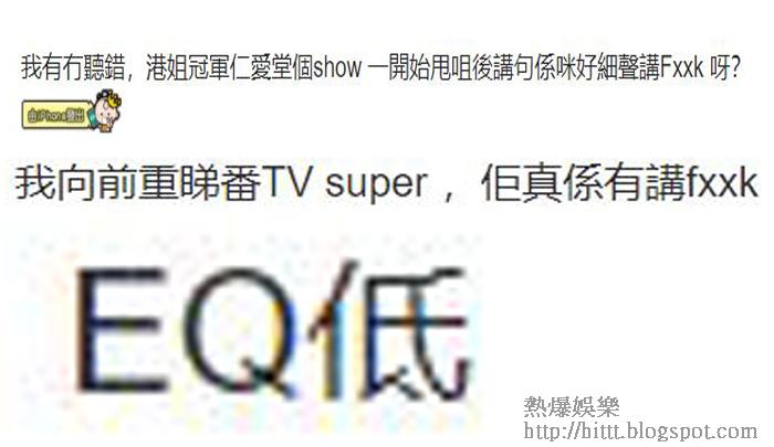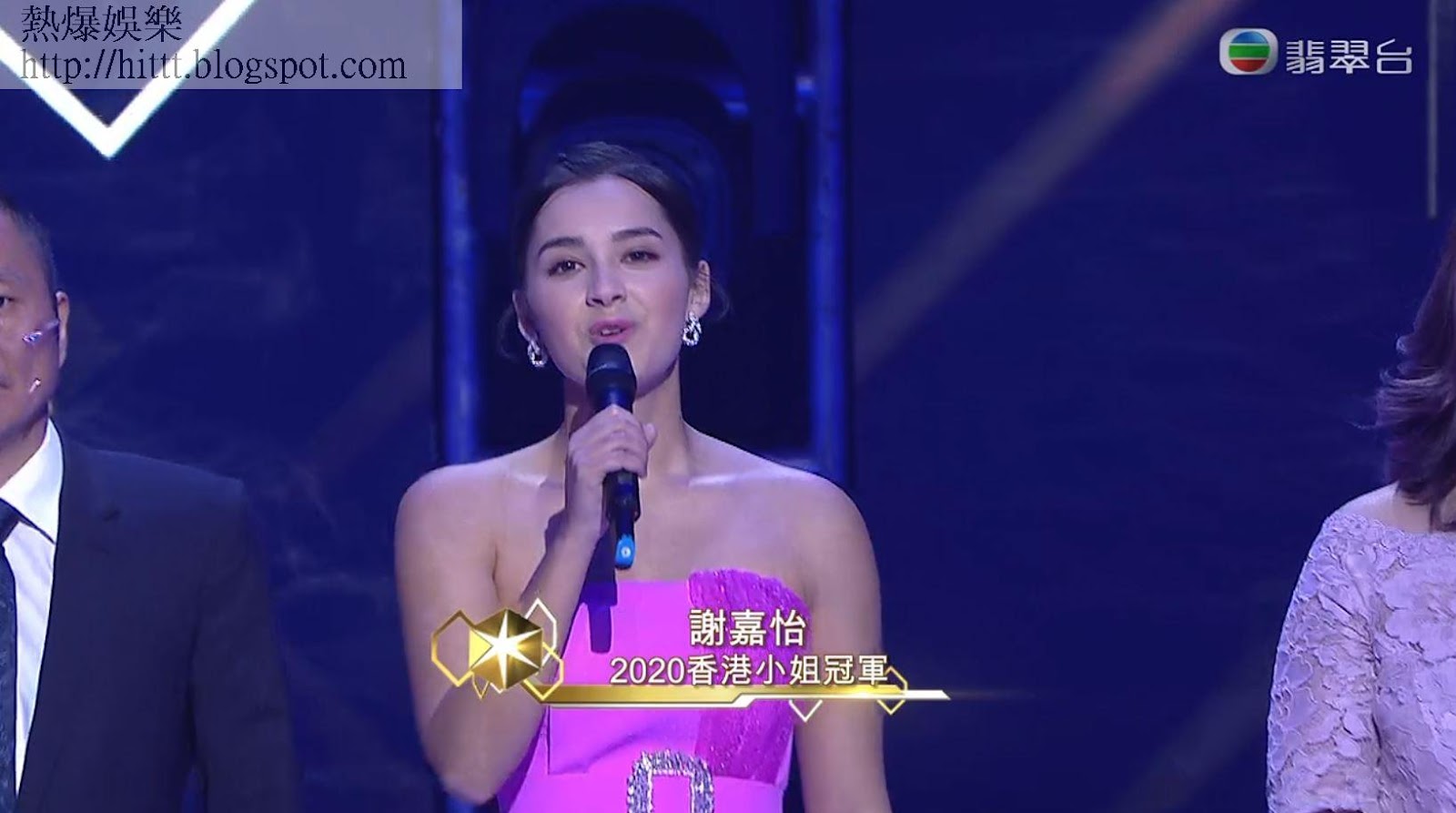 今屆港姐冠軍謝嘉怡,是香港蘇格蘭混血兒,由於外形甜美加上鬼妹仔爽朗性格,被譽為集美貌與觀眾緣於一身。今晚她和另外兩位當選港姐,亞軍陳楨怡和季軍郭柏妍,當選後首次在直播節目中擔任司儀。一開場穿上桃紅色晚裝的謝嘉怡便要打頭陣,企正一班總理的中間,逐一介紹嘉賓。不過謝嘉怡此時顯得十分緊張,頻頻甩嘴,加上口音不正,顧得鏡頭又顧唔到台詞,嚇到魂飛魄散的她,最後將要講的台詞忘記得七七八八,此時,她忍唔住細聲爆粗說:「FXXK!」而身旁的男士亦錯愕地望了她一眼,然後扮冇事耷低頭。事後網民在討論區紛紛留言聽到謝嘉怡爆粗,更有網民直指她「EQ低」。