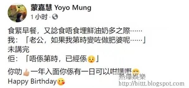 雖然伊健呢句話難聽過粗口,但蒙嘉慧未有因中正要害而發嬲,大讚老公叻豬:「你叻,一年入面,你係有一日可以咁講嘢,Happy Birthday。」網民大讚互寸的夫妻相處之道才是長久。