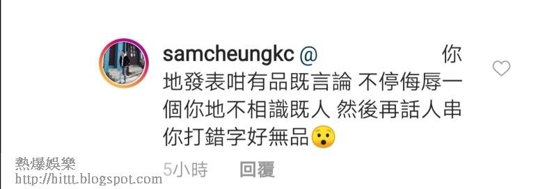 她的前男友Sam也即時挺身護花,加入戰團來為女友護航:「你地(哋)發表咁有品既(嘅)言論,不停侮辱一個你地(哋)不相識既(嘅)人,然後再話人串(寸)你打錯字好無品」