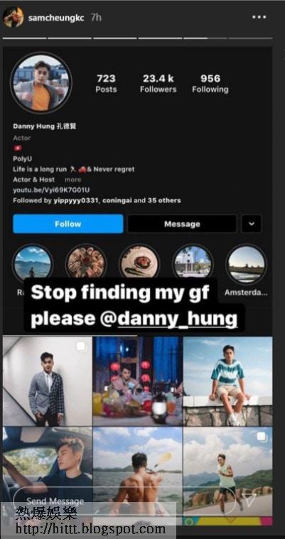 廖慧儀拍拖多年的男友Sam近日在限時動態分享孔德賢的IG首頁截圖,嚴辭地標記對方,並寫道:「Stop finding my gf please!(不要再找我女朋友!)」(IG/@samcheungkc)