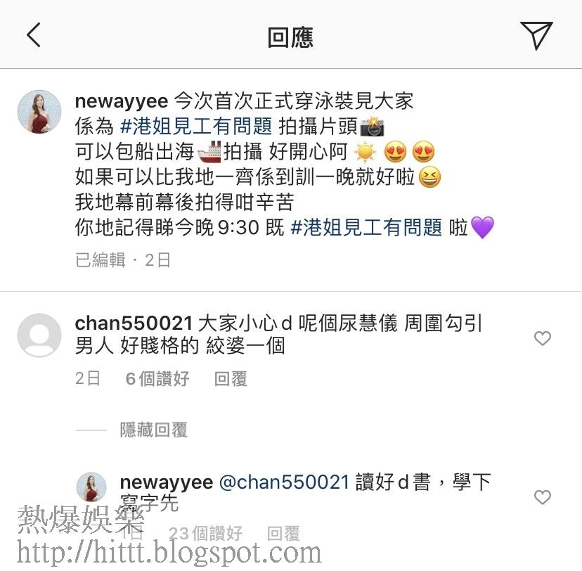 參賽期間,來廖慧儀都有於IG post靚相拉票,呼籲網民投她一票,但有網友竟然留言表示:「大家小心d(啲)呢個尿慧儀,周圍勾引男人,好賤格的,絞(姣)婆一個」,隨即引發起一輪罵戰。(葉志明攝)
