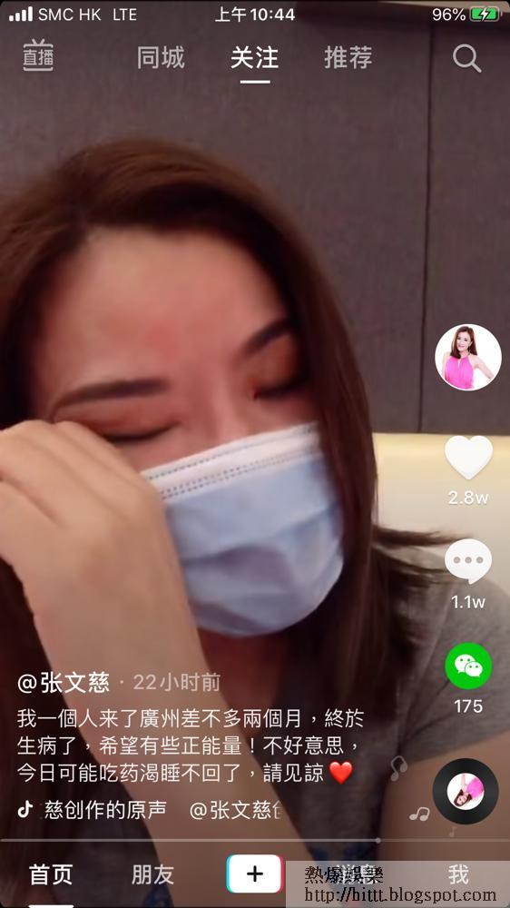 昨日她在抖音拍片,只見她躺在床上,雙眼通紅,而且額頭更現出一大片紅印,她聲音嘶啞地說:「我終於打敗仗啦,我昨天晚上開始咳,然後痰,有一點點發燒。」