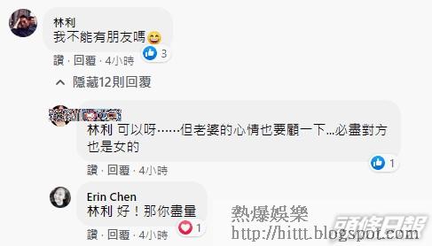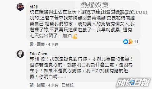 有網民留言「看起來好像沒甚麼事啊」,Erin回應:「難不成在床上抓到才算數嗎」?林利也給老婆留言:「我不能有朋友嗎😄」?Erin謂:「好!那你盡量」;林利再留言:「現在賺錢與生活在疫情下都很辛苦,那還有時間去想別的,這麼辛苦來找妳隔離回去再隔離,更要花時間經營自己,經營我們的家,成功男人的背後有個女人,我選擇了妳,不要再玩這個遊戲了,我早就很累…還有七天就出關了,加油💪」;Erin則謂:「嗯!我就是認真對待你,才如此尊重和包容!但你若是真心的,就該明白我為什麼生氣,是因為在乎!如果不是真心愛你,我不如找個有錢的魁(傀)儡!你明白嗎⋯⋯」?