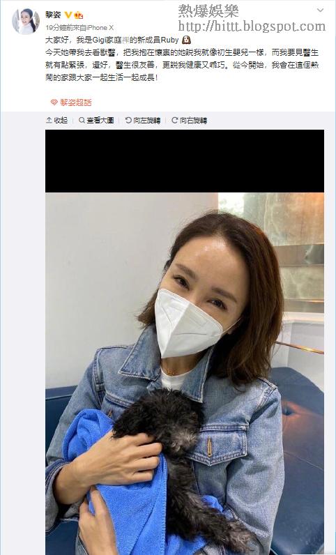 黎姿(現名馬黎珈而)身兼上市公司主席兼3女之母,事業家庭兩邊兼顧,生活應該忙得不可開交,但保養得宜的她亦會平衡生活,不時外出行山或做運動。今日她在社交網宣佈喜訊——家中再添「新成員」!原來是黎姿新養了一隻黑色小狗Ruby,她更代Ruby出post,與鄉親父老打招呼。