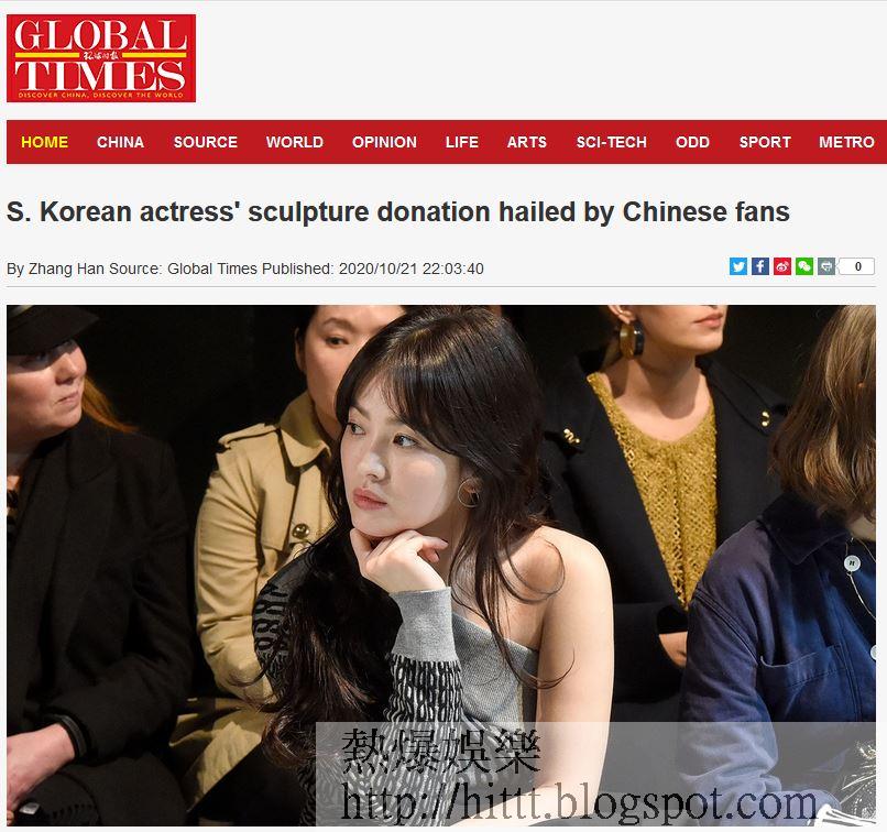 報道指,官媒《環球時報》英文版昨日提及喬妹向黑龍江省海林市歷史人物博物館捐贈了抗日戰爭英雄金佐鎮將軍銅像,並大讚喬妹的舉動受到fans和中國人的高度讚揚。文中分析因為武肺而受到國際社會批評的中國正致力於與韓國等國家維持友好關係,擔心BTS事件會導致中韓關係惡化,所以對喬妹的舉動就表示讚揚,透過官媒着手解決事件。而一眾大陸網民亦紛紛留言大讚喬妹舉動:「人美心更美」、「宋慧喬成為了中韓關係發展的窗口」等留言。