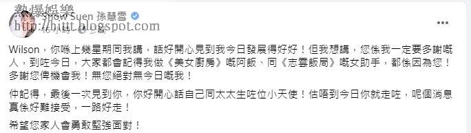 孫慧雪亦在社交平台留言:「Wilson,你喺上幾星期同我講,話好開心見到我今日發展得好好!但我想講,您係我一定要多謝嘅人,到咗今日,大家都會記得我做《美女廚房》嘅阿飯、同《志雲飯局》嘅女助手,都係因為您!多謝您畀機會我!無您絕對無今日嘅我!仲記得,最後一次見到你,你好開心話自己同太太生咗位小天使!估唔到今日你就走咗,呢個消息真係好難接受,一路好走!希望您家人會勇敢堅強面對!」