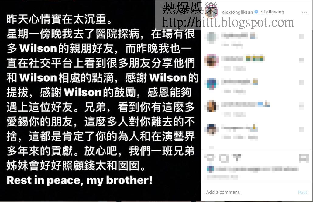 孫慧雪亦在社交平台留言:「Wilson,你喺上幾星期同我講,話好開心見到我今日發展得好好!但我想講,您係我一定要多謝嘅人,到咗今日,大家都會記得我做《美女廚房》嘅阿飯、同《志雲飯局》嘅女助手,都係因為您!多謝您畀機會我!無您絕對無今日嘅我!仲記得,最後一次見到你,你好開心話自己同太太生咗位小天使!估唔到今日你就走咗,呢個消息真係好難接受,一路好走!希望您家人會勇敢堅強面對!」