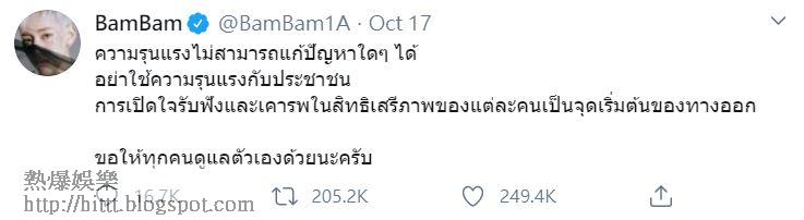 BamBam昨日於Twitter用泰文發文:「暴力解決不了問題,不要對人民使用暴力,聆聽和尊重個人權利及自由,是解決辦法的開始,希望大家都能夠注意安全。」不少fans及網民都感謝BamBam的發聲,令更多海外fans關注泰國的情況,亦有人留言感謝BamBam站在民主的一方。