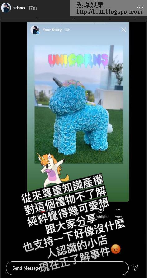 由於負評眾多,今早Stephy在限時動態留言:「從來尊重知識產權,對這個禮物不了解,純粹覺得幾可愛想跟大家分享,也支持一下好像沒甚麼人認識的小店,現在正了解事件。」