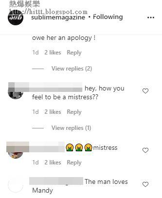 雖然Mandy做才女博洗底,不過就有不少網民去雜誌IG踩場,指她唯一可以得到寬恕,就是向洗米華太太陳慧玲(Heidi)公開承認自己有幾錯,以及離開她的丈夫,認為Mandy一直欠洗米嫂一個道歉,亦有人留言問她作為情婦的感受,另有網民指她搶人老公,這個破壞別人家庭的人在專欄講家庭是相當諷刺,更有網民問她收3億做情婦還不夠等,紛紛為洗米嫂出氣。