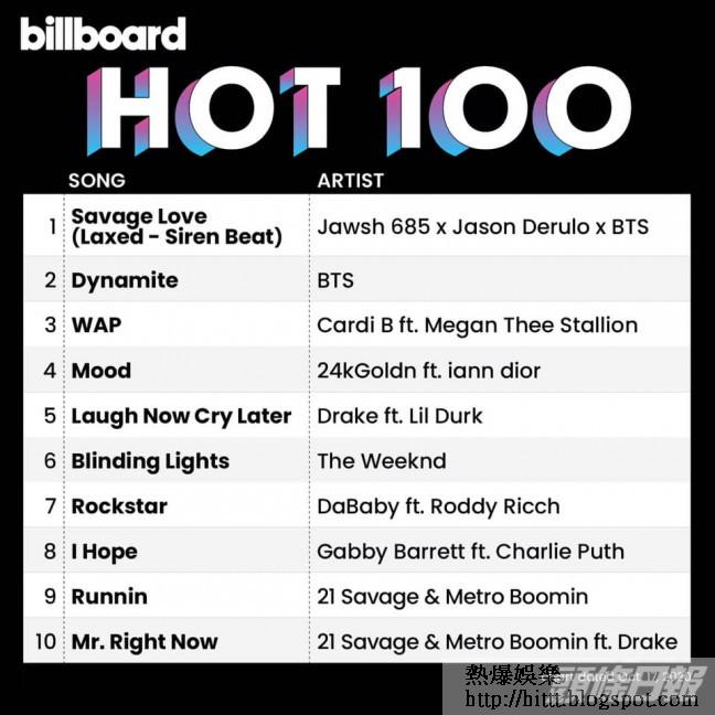 內地粉絲好嬲,但全世界ARMY(BTS歌迷稱呼)就非常興奮,事關BTS首支英文單曲《Dynamite》一出便登上美國Billboard「Hot 100」冠軍位置,是首組奪得Billboard冠軍的K-Pop歌手,南韓總統文在寅亦發文祝賀。最新消息是BTS重新混音並翻唱的英語歌《Savage Love》亦登上Billboard「Hot 100」首位,加上第2位的《Dynamite》,「熱百」的第一和第二全包,是十年來首位有此成績的藝人。