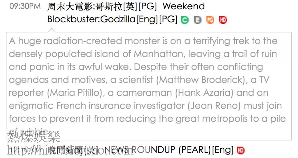昨日(10月17日)TVB明珠台於晚上9點30分的「周末大電影」時段,原本播出2014年由「緋紅女巫」伊莉莎伯奧遜(Elizabeth Olsen)及「快銀」亞倫強森(Aaron Taylor-Johnson)主演的《哥斯拉》預告。