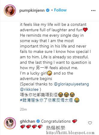 Tyrese及Jenn今日各自在社交平台出post公佈喜訊,當中陳凱琳、馬天佑等亦有在Jenn IG祝賀,馬天佑更tag了Tyrese叫他要對Jenn好一點。Tyrese在自己IG上透露整個求婚過程是出乎意料的情況下完成,他又感謝女友出現在自己生命中,完整了他:「你的愛令我明白甚麼才是真正的愛情,你帶給我不只是快樂,也是動力的起源。」Tyrese又感謝女友,令自己由一個被動、隨遇而安的人,變成有動力去作出改變、實踐目標的人,Tyrese向女友發表愛的宣言:「是你令我覺得自己不能再怠慢下來,因為我知道我人生中不再只是我自己一個走,我擁有了一個好靚好聰明好勤力又好愛我的女人,能夠遇上這麼優秀的她是多大的福氣。」