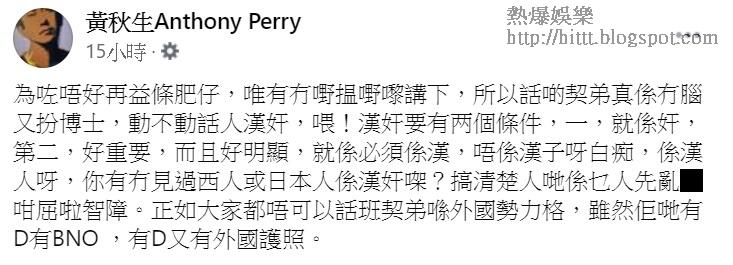 秋生日前在其社交平台分享該片段,以「契弟」稱呼該名YouTuber,指他「冇腦又扮博士」,秋生留言說:「喂!漢奸要有兩個條件,一,就係奸,第二,好重要,而且好明顯,就係必須係漢,唔係漢子呀白痴,係漢人呀,你有冇見過西人或日本人係漢奸㗎?搞清楚人哋係乜人先亂X咁屈啦智障。」