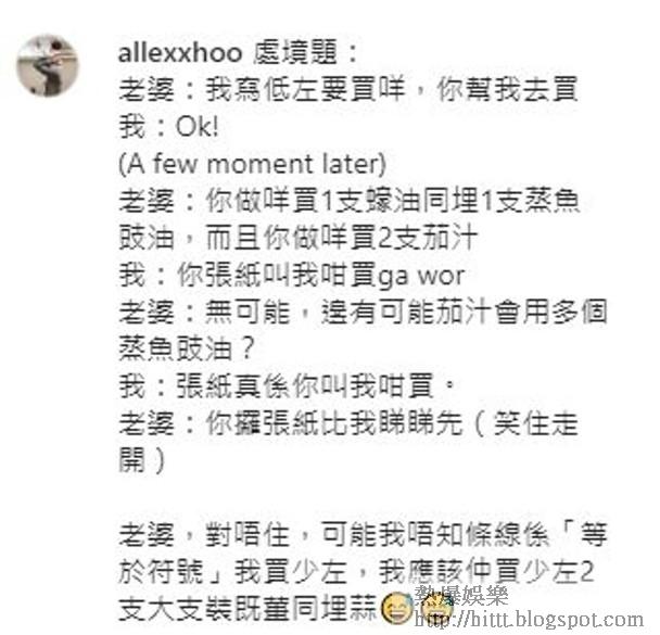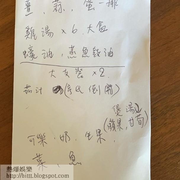 另外,由於吳若希正在家休養,買餸重任則交由老公Alex負責,為免老公忘記,事前特意寫好購物清單,點知因為誤解清單上嘅符號,搞到買漏嘢,Alex表示:「老婆,對唔住,可能我唔知條線係『等於符號』,我買少咗。」