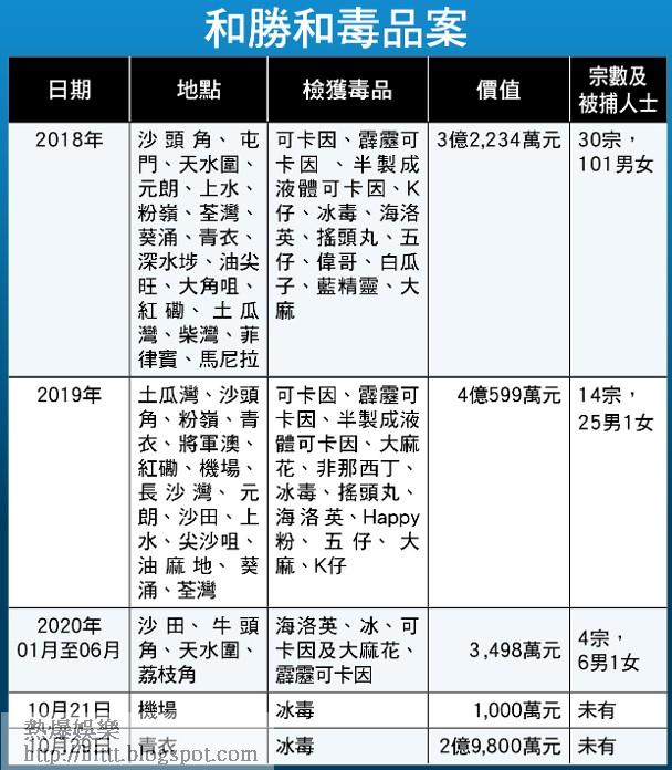 執法部門繼續狙擊本港黑幫和勝和前坐館泰國大毒梟「上海仔」郭永鴻的販毒集團,918日內破獲50宗涉及和勝和毒品案,香港海關於10月29日,在青衣海關驗貨場偵破歷來最大宗水路販運冰毒案件,檢獲逾500公斤懷疑冰毒,估計市值約2億9800萬元。