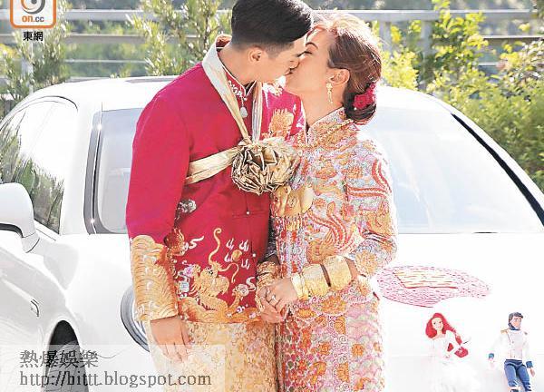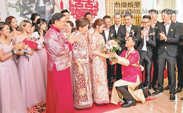 下午他們到沙田一間酒店的戶外園林草地舉行婚禮。約3時,Fred親自駕名車載阿詩到酒店,獲兄弟姊妹團迎接,之後齊齊一字排開影大合照。一對新人以中式禮服現身,穿「褂王」的阿詩行頭強勁,除戴上大串金頸鏈外,還有分量十足的金豬鏈,雙手則佩戴5對超厚身的「流星錘」龍鳳鐲、金戒指及3隻鑽戒,在陽光下金光閃閃。他們應記者要求咀足幾次,Sweet爆全場!