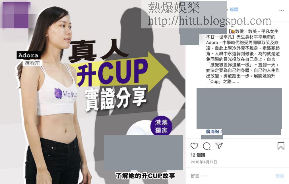 《蘋果》昨日收到讀者爆料,指獲得「最完美體態獎」的7號吳燚曦(Adora),原來在大約3年前曾為美容公司做過隆胸代言人,網上更流傳Adora隆胸前後的短片。片中見Adora以素人身份擔任代言人,當時報稱24歲,是一名學生,在立體掃描影像下,胸部平平無奇,她直言向來不滿自己身材:「我本身pat pat比較大,但上身又好平,好奇怪,似隻唐老鴨咁。」在手術床前,Adora顯得有點緊張,幸最後手術順利完成,由A Cup 變C Cup,Abora與另一位代言人一同拍攝開胸性感照片做生招牌,她自覺很成功,自信爆棚謂:「做完療程感覺係非常之好,好自然,冇我想像中出嚟個胸好假,完全冇,我對住塊鏡,一面跳,一面做各樣動作,其實個胸係跟住我一齊有起伏,所以係非常之自然。」