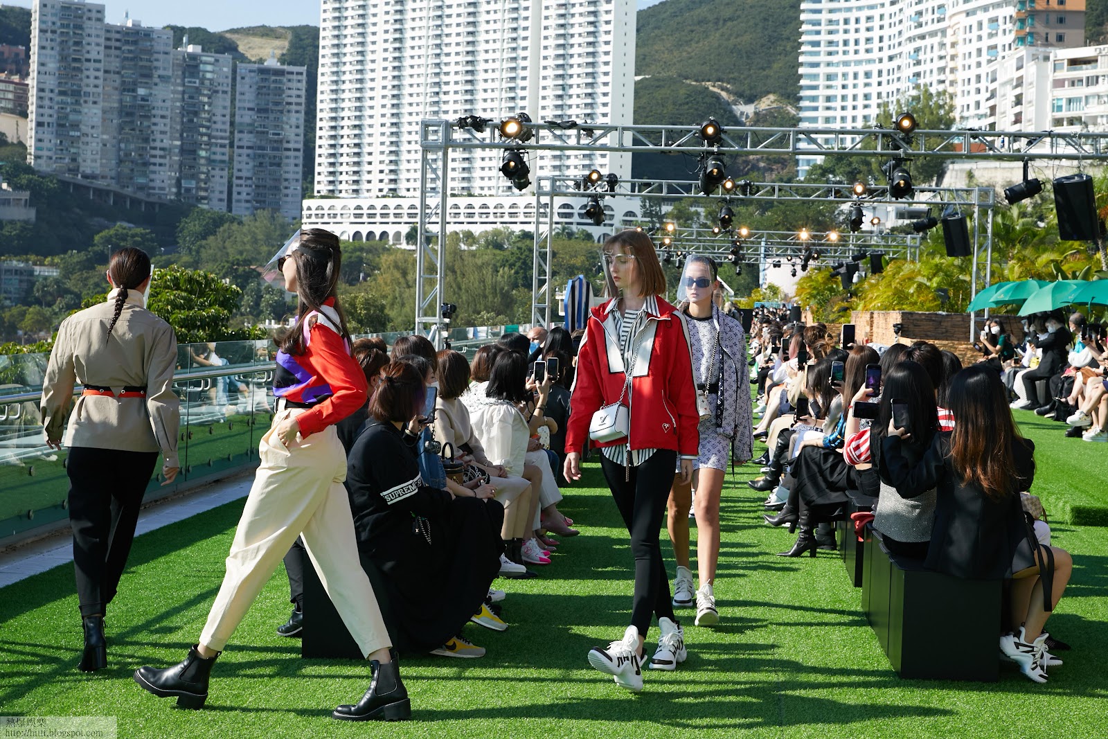 時尚界近日慢慢起動,逐步小心重啟各類活動、時裝騷,渴求回歸正常過日子。Louis Vuitton 今日㨂在淺水灣的戶外舉行度假系列時裝騷,吸引不少時裝迷捧場,熱鬧front row、熟悉的模特兒行騷,人人拍照交談,有種仿如隔世的味道,一一喚回疫前的時尚美好回憶。 Runway 兩邊的座位分隔安全距離,模特兒如:王曼喜、王麗嘉等,全戴上透明面罩行騷,做足防疫措施。