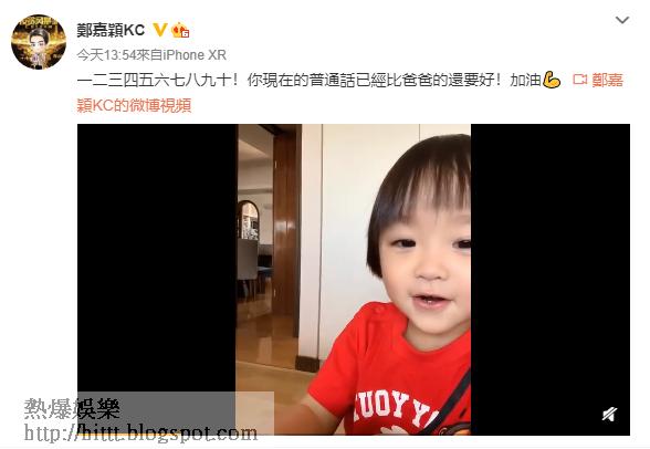 片中看到1歲半的Rafael剪了個「冬菇頭」,他對着爸爸的鏡頭講出普通話1至10,雖然有部份發音不算準確,但其BB聲加上全程笑容滿面,已經攞晒分!成功數完1至10的Rafael應該也覺得自己叻仔,興奮尖叫,也聽到鏡頭後的鄭嘉穎的笑聲。鄭嘉穎在post中大讚Rafael:「一二三四五六七八九十!你現在的普通話已經比爸爸的還要好!加油!」其實鄭嘉穎曾到台灣發展,又返過大陸拍劇掘金,其中他更憑《步步驚心》的角色「八阿哥」走紅,他這樣盛讚兒子,顯然愛子深切。