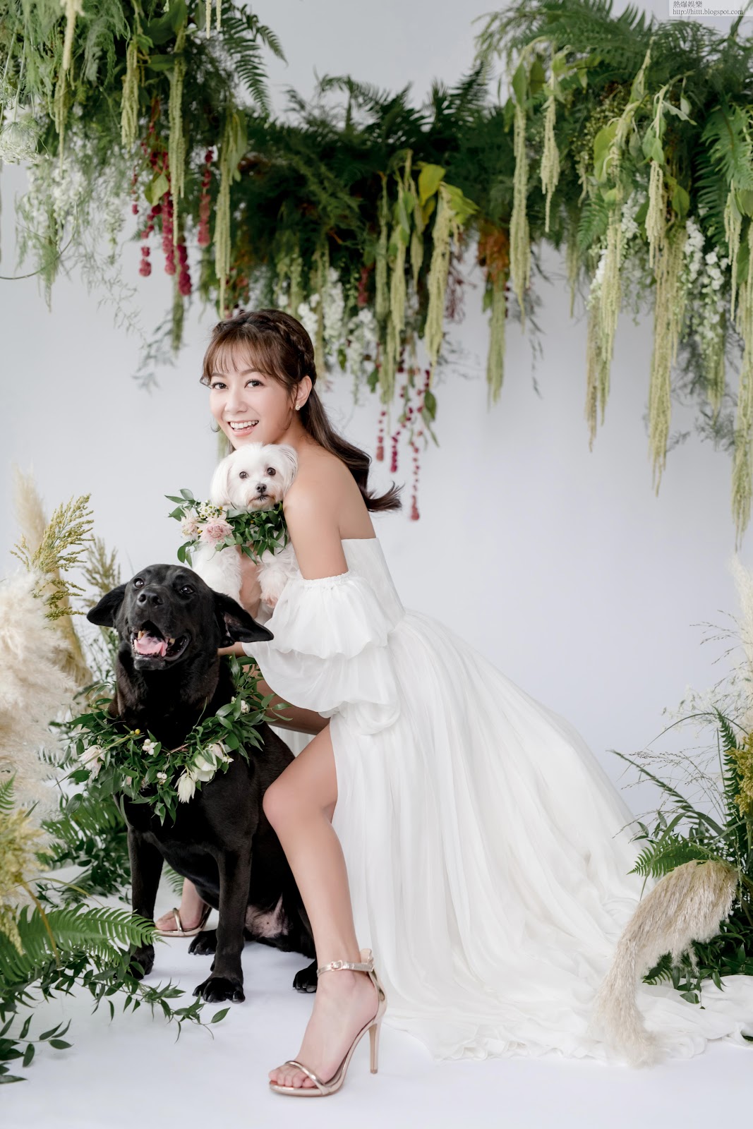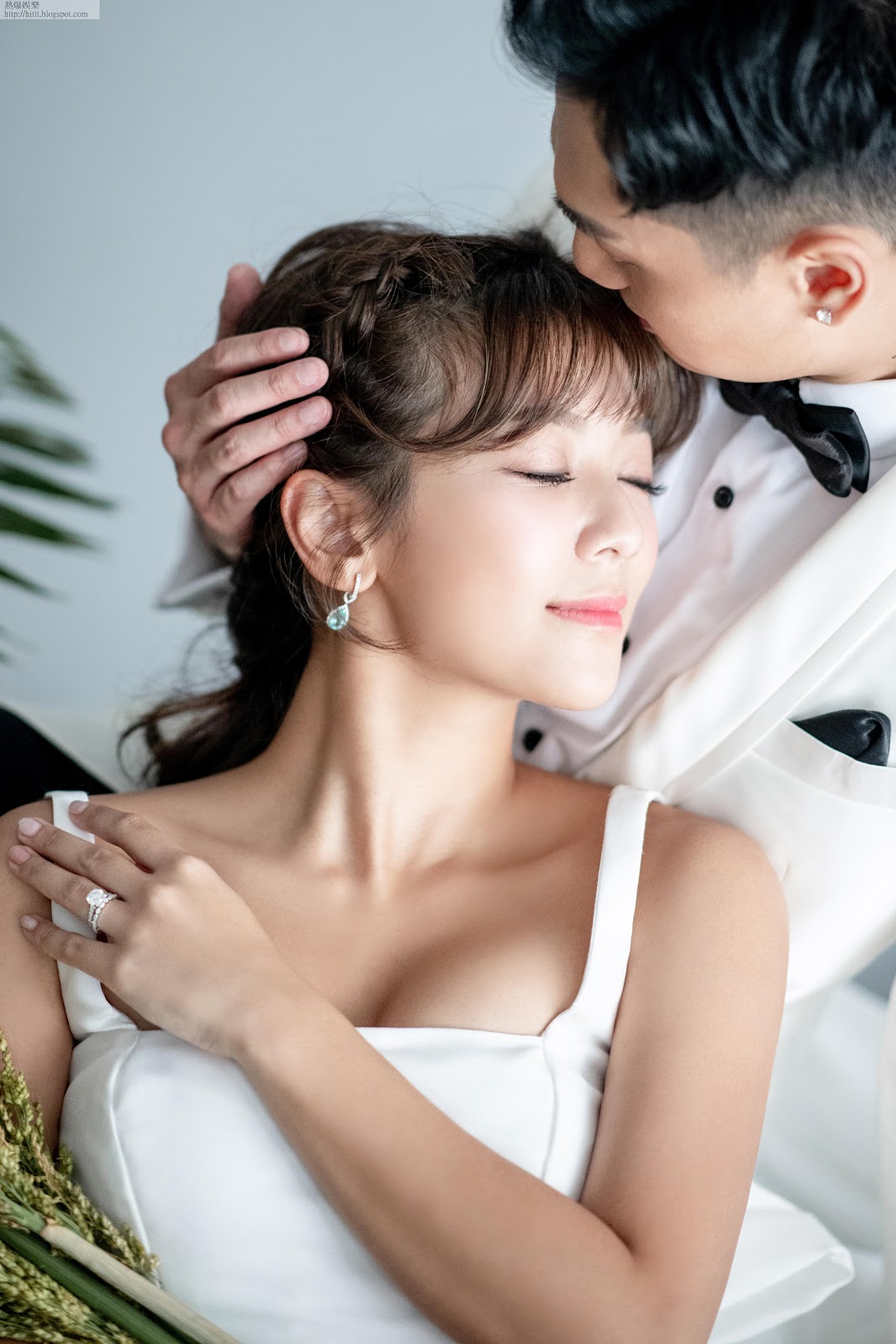 一對準新人較早前已拍攝了多輯婚紗照,新娘選的婚紗既低胸露半球又騷腿,性感之餘更充滿青春氣色,新郎哥穿的白色禮服就感覺較正經,還有一款照片是何雁詩穿黑Bra襯黑外套,也略帶性感。