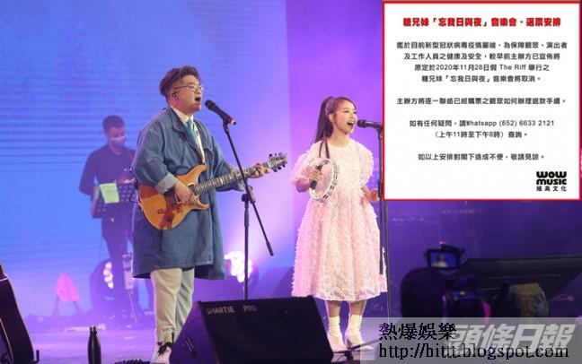 新冠肺炎爆發第四波,疫情嚴峻,原先組合糖兄妹在本周六(28日)於中環舉行的2場《忘我日與夜》音樂會,銷情反應理想,由原本一場加開同日的日場共兩場,不過嚴峻疫情下,為保障觀眾、演出者及工作人員之健康及安全,主辦單位宣佈音樂會取消,並會逐一聯絡已經購票之觀眾如何辦理退款手續。