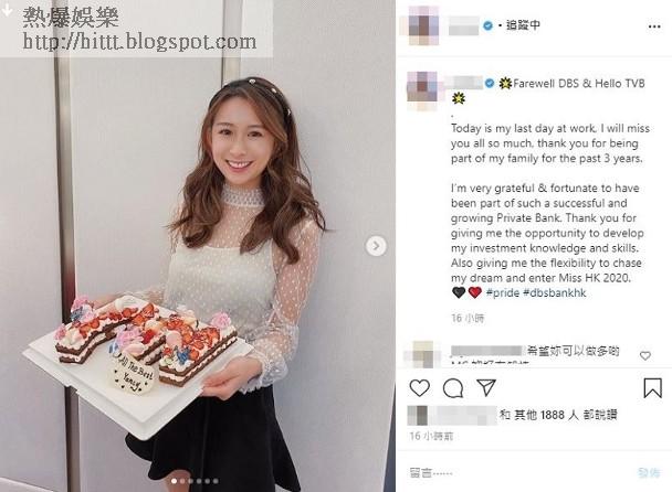估唔到任職銀行嘅落選港姐黃婉恩亦決心加入娛圈,今日喺社交網宣布辭職唔做銀行,並上載多張派散水餅嘅相片,多謝一班同事照顧咗自己3年咁耐,更公布已經加入無綫呢個大家庭,佢以英文留言:「今日係我last day,我會好掛住你哋,好多謝呢3年,大家好似屋企人。好感恩可以有機會畀我去增加我投資知識,亦等我可以靈活咁去追求自己夢想,參加香港小姐。」網友亦送上祝福,希望可以快啲喺電視見到佢!