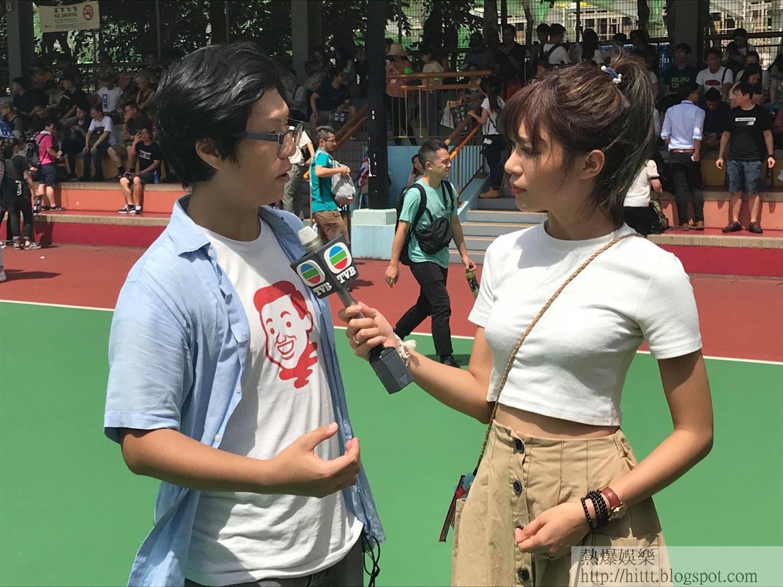 阮嘉敏上年曾以鮮黃色小背心裝扮去採訪屯門公園歌舞團。(電視畫面)