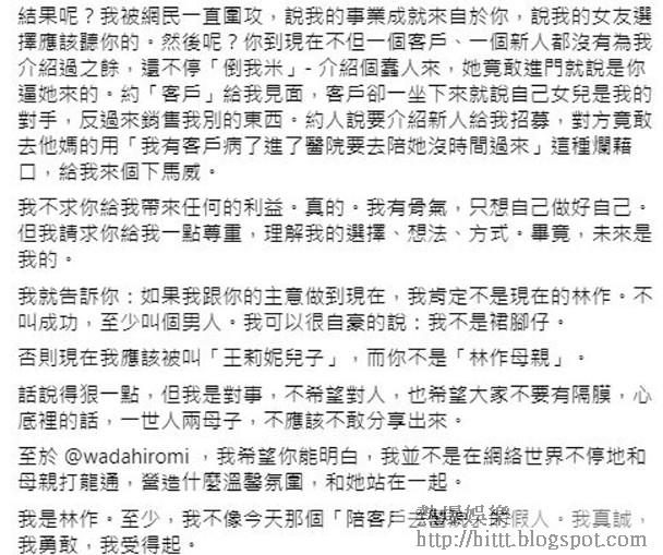 林作表示自己有骨氣,但請求給他一點尊重,理解他的選擇、想法、方式。他重申:「第一,沒有辦法控制你私底下(母親)對一個人的看法,但請你自重,不要再公開地侮辱我的女朋友了。你也在侮辱着我。第二,我明白你愛子心切,真的,但我希望我們不在商業上有任何的合作了。因為我和你,方式太不一樣。我從不熱臉貼冷屁股。」