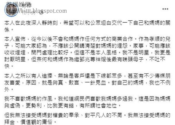 他直指不喜歡媽媽作事的作風,知道網民喜歡他的媽媽,是因為她夠虛偽,更勢利,比他更有錢,和所謂的社會地位,他直說:「但我無法接受媽媽對權貴的奉承、對平凡人的不屑。我無法接受媽媽的拜金、價值觀的庸俗。」他更指母親對她的女友不尊重:「到目前為止,她倆從未接觸,而我媽媽發了瘋般地拒她於門外,好像她持續有肺炎那樣。幾次的媒體訪問,對她的不屑,完全到了一個侮辱的地步。這對和田(裕美)小姐造成的創傷,嘴賤的網民,會幸災樂禍,但看在眼裏的我,是完完全全我媽媽的問題。我不介意她所謂『傳統』觀念導致她食古不化,但如此公開般的去厭棄一個她毫無接觸的人,完全對我來說,反映出她的人格問題。」