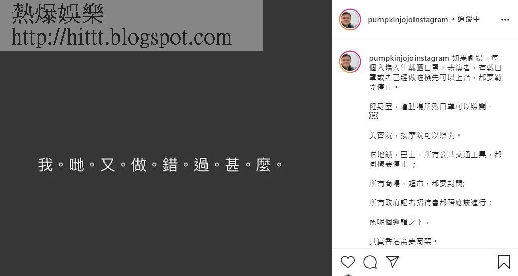 武漢肺炎疫情第四波殺到,今天林鄭月娥宣佈收緊本港的防疫措施,當中表示要關閉娛樂場所,有政府表演場地周三起需要關閉兩周。由風車草劇團製作的《新聞小花的告白2白屋之夏》正在葵青劇院演藝廳演出,劇團創作總監兼主演的梁祖堯得知要煞停演出的消息,難掩不滿,並呼應林鄭日前接受媒體訪問時,被問到對於造成社會動盪,她稱沒有感到內疚並反問「我做錯了甚麼?」,梁祖堯今天亦在IG上貼文:「我哋又做錯過甚麼」,他撰文直指政府後知後覺,又質疑健身室、按摩院戴口罩可以照開,為何表演場地做足防疫措施又不能如常演出?更謂這邏輯下香港應該需要宵禁。