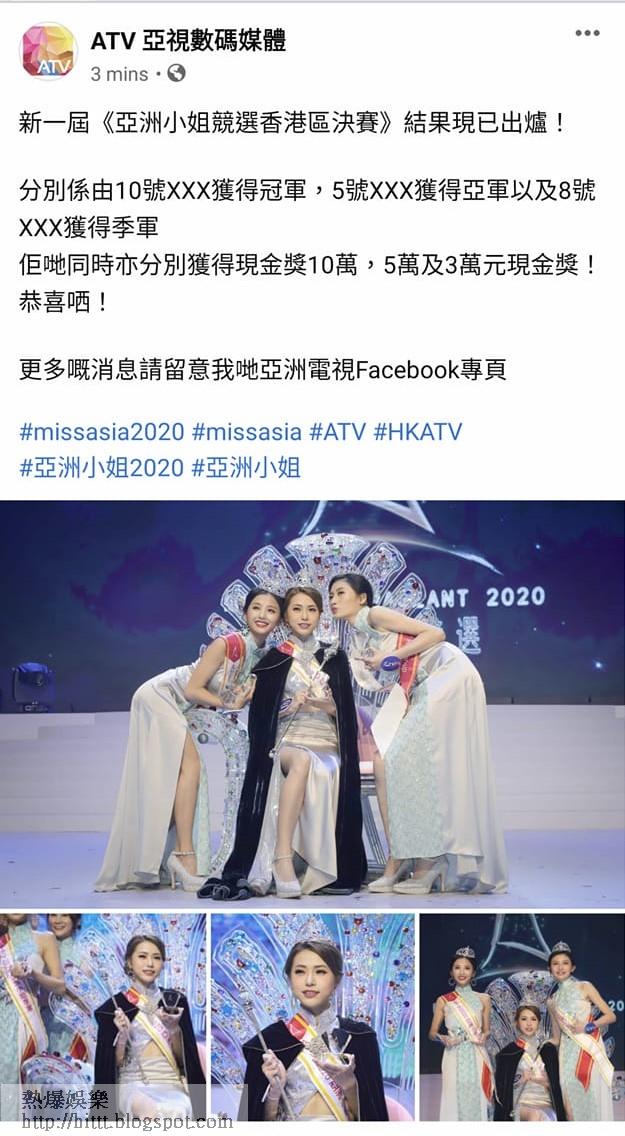 前亞洲電視變身網上電視台,現改名為《ATV亞視數碼媒體》。昨晚舉行2020亞洲小姐香港區決賽,400位嘉賓毋懼疫情,齊集位於大埔的亞視廠房,一齊欣賞簡單得如學校歌唱比賽的「亞姐騷」。是晚冠軍由以私人原因退選今屆香港小姐的蔡小蝶奪得,何雙妍獲亞軍,高文君則成為雙料季軍,並奪「最上鏡小姐」。