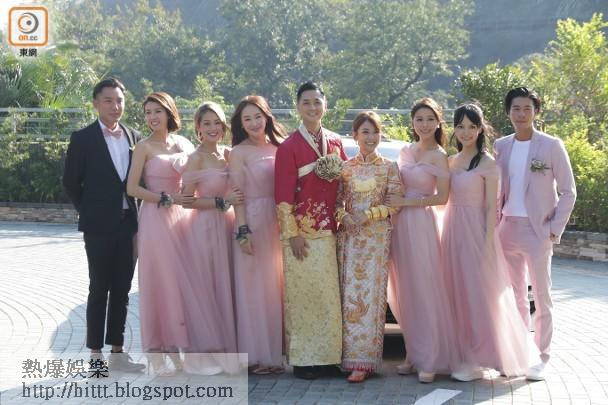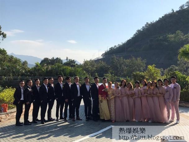 早上一對新人已在女家進行了中式傳統的接新娘儀式,下午約二時,一班兄弟姊妹一起抵達酒店。姊妹團以粉紅色姊妹裙上陣,而兄弟團則穿上黑色西裝。最搶鏡的可算是蔡思貝,她腳上一對粉紅色sneaker好搶鏡。之前天文台曾預告颱風逼近,天氣可能變差,但今日天氣風和日麗,連上天都對一對新人送上天公成美的「大賀禮」。