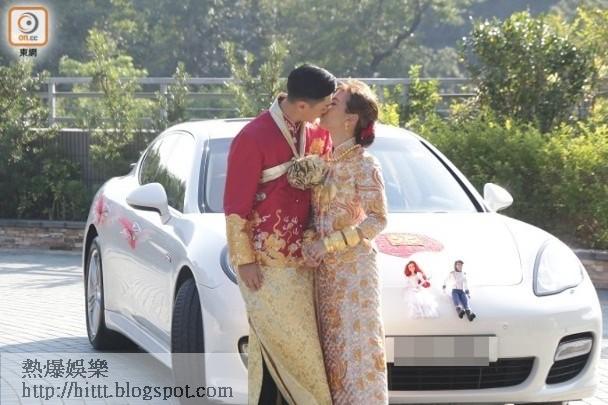 而約3點幾,新郎Fred做司機親自駕車載阿詩到酒店,兄弟姊妹團迎接及影大合照,一對新人穿上中式禮服現身,着龍鳳裙褂的新娘子阿詩行頭強勁,除頸上有大串金鏈外,還有分量十足的金豬鏈,雙手佩戴多對超厚身的龍鳳鐲,還有數對金戒指及鑽戒,陽光下全身金光閃閃,阿詩所戴的3隻鑽戒,左手無名指是訂婚戒指,但她表示已忘了訂婚戒有幾多卡,而新人應傳媒要求下甜蜜咀嘴,閃爆全場。至Fred的唱片公司老闆何哲圖到場送人情。